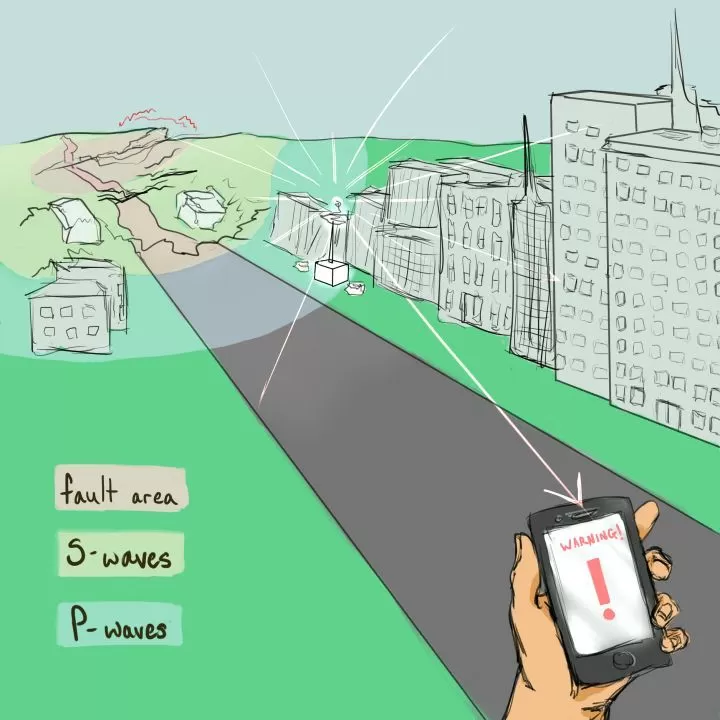 地震预警系统运行中:当地震开始时,检测到快速移动的P波,可以在较慢移动的表面波到达之前传播紧急信息。