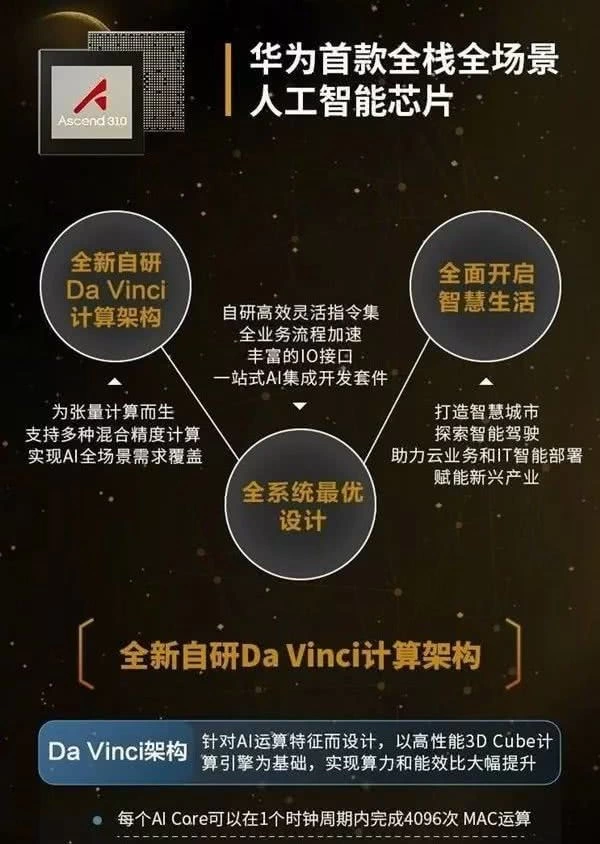 值得期待的是,麒麟810处理器还会搭载NPU芯片,并且还会是华为自研的自研AI芯片,有可能是华为去年十月份推出的昇腾310。主要特色是基于达芬奇架构和采用了12纳米工艺,使用了华为自研的高效灵活CISC指令集,据传日常使用与麒麟980的寒武纪NPU芯片没有什么差别。