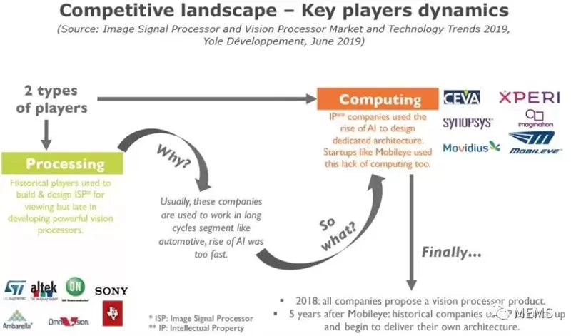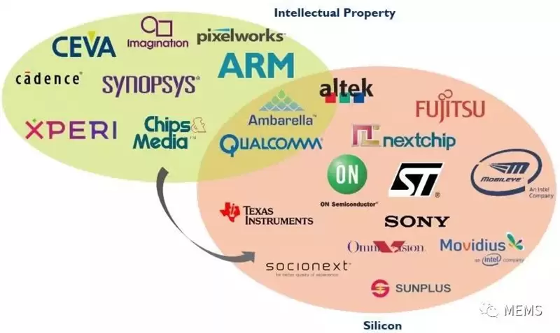 应用于成像市场的处理和计算硬件已经分为两种不同的商业模式。知识产权公司没有实体产品,但芯片公司出售物理实体——处理器。每种类别的领导厂商都很容易从市场上发现,ARM和Synopsys是知识产权领域的领导者;豪威科技(OmniVision)、Mobileye和安森美半导体(ON Semiconductor)是芯片领域的领导者。