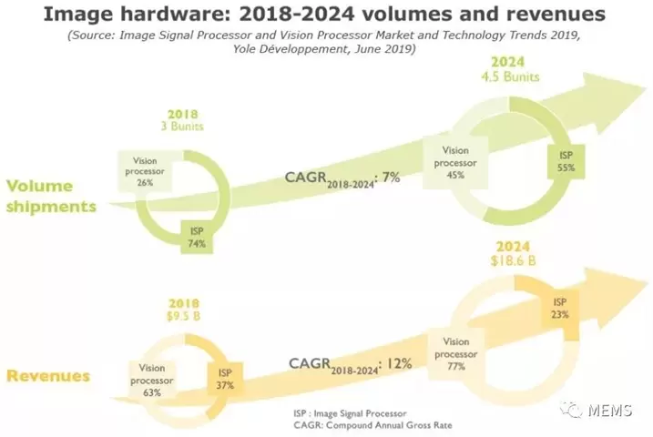 但是,如果要运行图像分析软件,则需高功率计算和内存,这导致了视觉处理器的研发和应用。根据Yole市场统计,视觉处理器市场正在爆发性增长,2018年至2024年期间的复合年增长率(CAGR)高达18%,预计2024年将达到145亿美元规模。同时,图像信号处理器保持低速稳定增长态势,2018年至2024年期间的复合年增长率仅为3%,预计2024年将达到42亿美元规模。