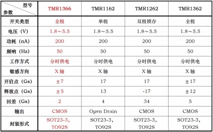多维科技纳安级低功耗TMR磁开关传感器芯片系列产品选型表
