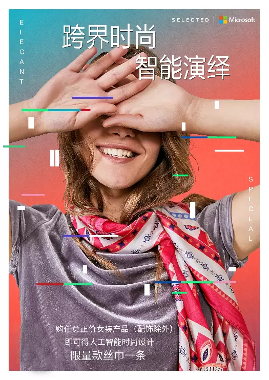 SELECTED携手微软小冰推出人工智能设计的印花丝巾,将服装设计与人工智能相结合,是时装、科技与艺术的一次跨领域碰撞与融合。此款丝巾图案是人工智能微软小冰基于时下流行趋势、SELECTED品牌特性和消费者情感诉求等因素,为SELECTED设计的专属印花图腾。小冰的设计具有鲜明的特色,能够按需定制并保持高度的质量稳定性,将艺术元素融入到服装服饰的纹样设计中,实时创作出独立全新的作品,将亿万个独一无二且赋有原创性的纹样设计展现在人们面前,使时尚纹样在人工智能创造技术的加持下,绽放出新的生命力。