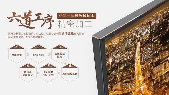 在优雅高贵的配色背后,索尼U8G液晶电视还有大气、严谨的工业设计来支撑颜值。六道精密工序——金属挤型、CNC切割、金属拉丝处理、黑色阳极氧化、钻石切割、琥珀金阳极氧化,每一项工艺技术都让琥珀金在光影流动间更加亮眼,却又不喧宾夺主,得以彰显年轻人群特立独行的审美品味。