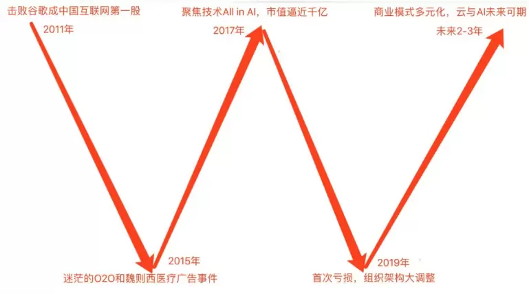 W曲线的左侧部分是2011年百度击败谷歌成为中国互联网第一股,领衔BAT;到2015年,迷茫的O2O和魏则西医疗广告事件;曲线的右侧部分是在2017年聚焦技术All in AI,重新市值逼近1000亿;到2019年,也就是今年。百度首次亏损,组织架构大调整。