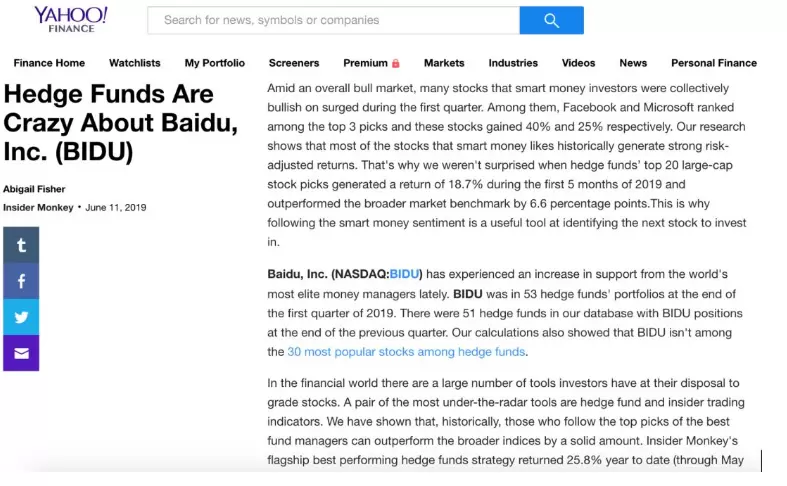 今年6月,雅虎财经也刊载了一篇名为《Hedge Funds Are Crazy About Baidu》的文章。