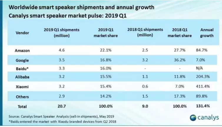 根据Canalys 发布的2019年Q1 全球智能音箱市场报告,百度2019年Q1 小度智能音箱出货量达330万台,仅次于谷歌的350万台及亚马逊的460万台,成为中国市场第一,全球市场第三。