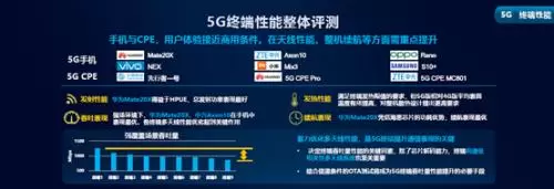 5G终端整体性能方面,无论手机还是CPE产品,其用户体验已接近商用条件,但在天线性能、整机续航等方面需要重点提升。本次评测选取了华为Mate20X、中兴Axon10、OPPO Reno、vivo NEX、小米Mix3、三星S10+共六款5G手机以及中国移动先行者一号、华为5G CPE Pro、中兴5G CPE MC801三款5G CPE产品,针对发射性能、吞吐量表现、发热性能、续航表现四个方面进行质量评估。
