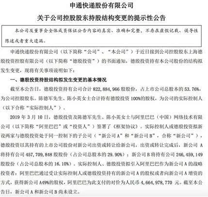 最新消息:申通快递发布控股股东持股结构变更的进展公告。公告显示,申通快递大股东德殷控股已经将其持有的德殷德润49%股权转让给阿里巴巴,并已经办理了工商变更登记手续,阿里巴巴成为持有德殷德润 49% 股权的股东,为此将支付人民币对价46.7亿元。