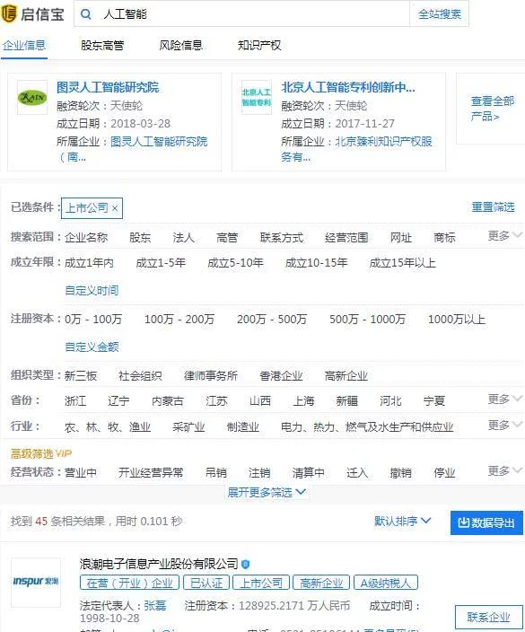 根据启信宝的数据显示,中国人工智能的上市公司已经达到了45家了,可见人工智能的时代已经到了。