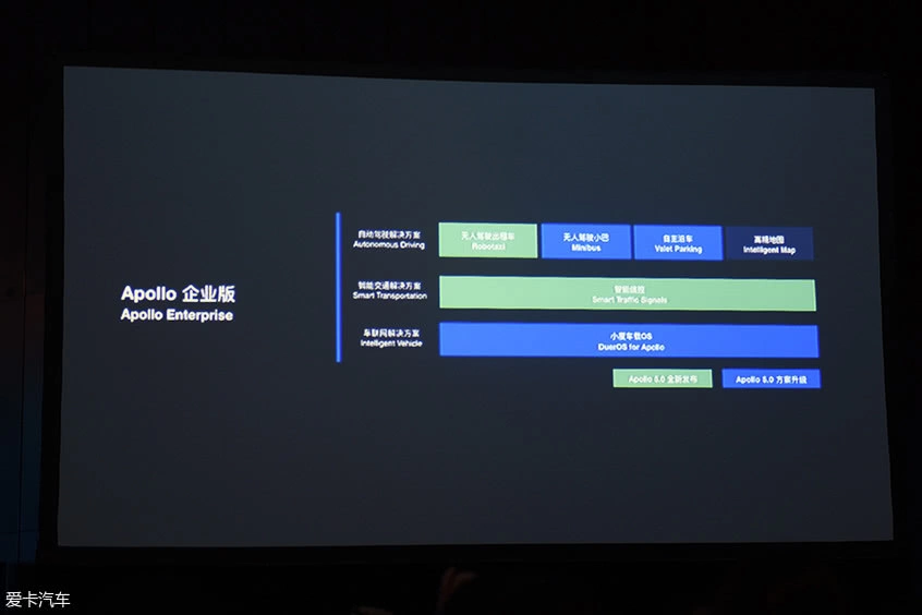 Apollo企业版包含自动驾驶解决方案、智能交通解决方案和车联网解决方案。其中无人驾驶出租车Robotaxi、智能信控两大量产解决方案为全新发布,无人驾驶小巴、自主泊车、小度车载OS三大能力进行了升级。