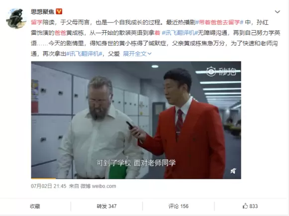 这一幕也是让很多观众感动,感叹父爱的伟大。带着爸爸去留学剧方也专门感谢了讯飞翻译机对剧中人物的一路陪伴。