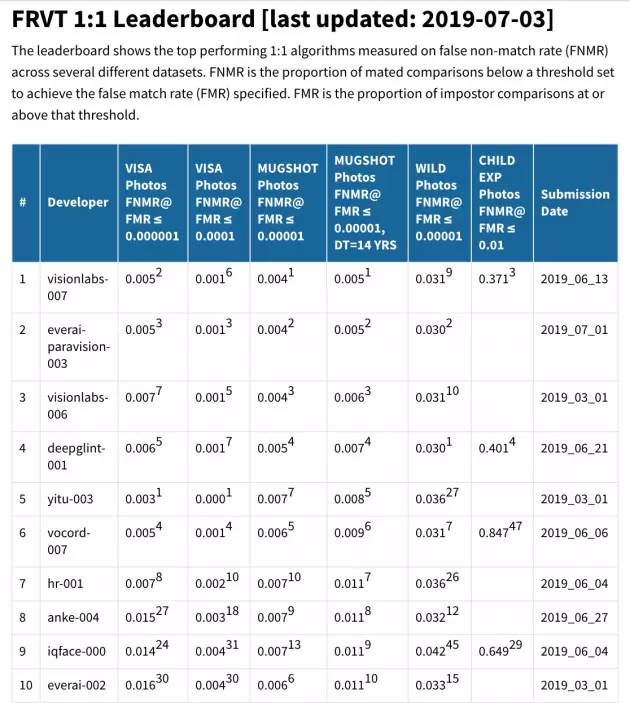 人脸识别算法测试FRVT由美国国家标准与技术研究院(NIST)主办,NIST直属美国商务部,主要任务是建立国家计量基准与标准,以提高国家技术基础,改进行业产品和服务。FRVT通过不同类型的照片样本进行上百亿次对比,对人脸识别算法的评估可达到百万分之一精度,也是当今全球规模最大、标准最严、竞争最激烈、最权威的人脸识别算法竞赛,素有工业界黄金标准之称。截至目前,全球已有近百家公司和研究机构参与了此项测试,包括VisionLabs(俄罗斯)、Ever AI(美国)、 Vocord(俄罗斯)、 依图、商汤、旷视、海康、大华、腾讯等等。