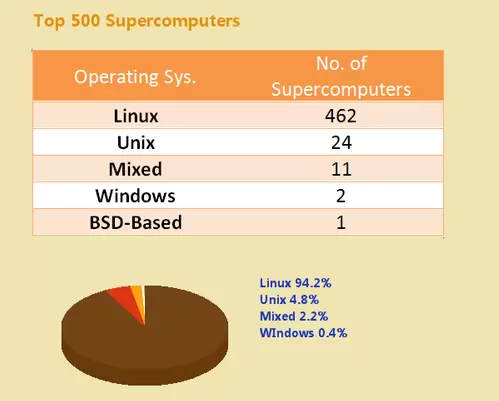 以最强调性能的超算领域为例,早在2012年时国际TOP500组织公布的全球超级计算机500强排行榜中,Linux在超算Top500名中占据了其中462台的操作系统宝位,占比94.2%。