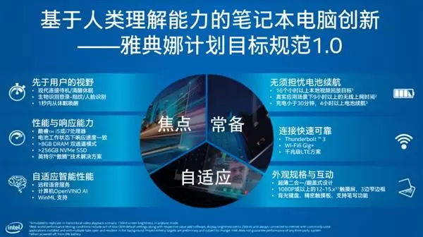 笔记本上应用AI技术将是未来的常态,以致于Intel在最新的雅典娜计划中也将自适应智能性能列为雅典娜计划六大技术之一,包括远程语音服务和支持OpenVINO™和WinML等功能,它们依靠的就是AI性能2.5倍提升的DL Boost指令集。