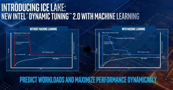 AI在处理器上的一个应用就是Intel的Dynamic Tuning 2.0动态调节技术,它是一种CPU频率调节技术,可以提高CPU性能或者降低功耗,其原理就是基于AI技术预测工作负载,让处理器更长时间运行在更高性能状态,不会快速掉频。