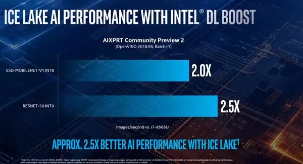 DL Boost指令集原本是用在Xeon可扩展处理器上的,但是Intel很快也在消费级CPU上引入了这个新技术,首发的是Ice Lake处理器,支持该技术之后其AI性能相比前代CPU有了大幅提升,执行AI运算性能可达之前处理器的2.5倍多。