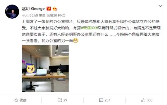 7月10日,今日凌晨荣耀总裁赵明突然在微博分享一张自己办公室照片,给各位网友留下一定玄机,说是分享升降办公桌子的感受,不过广大网友还是觉得另有玄机。