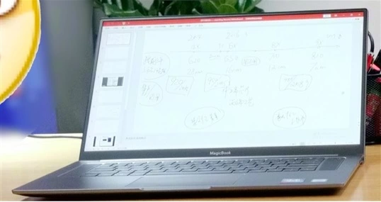 办公室位置是整体靠墙的,以单独色调为主,比较素雅,并没有其他花里胡哨的东西。荣耀总裁赵明桌子上有一台笔记本,放大仔细看可以看到笔记本开着PPT,有可能是正在准备荣耀9X新品发布会的PPT内容,这款笔记本和市面上已经发布的笔记本不一样,边框非常的窄,像是荣耀MagicBook,以及荣耀MagicBook 2019款都不是这个造型,有可能这款笔记本就是新款产品。最近锐龙发布三代处理器,是不是可以期待一下这款新品会搭载第三代锐龙呢?