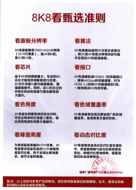 8K并不是4K分辨率乘以2这么简单的得来,必须按照分辨率与像素点对应来计算,对于8K的发展,TCL有着相当的发言权。前段时间,TCL率先发布了全球首台5G+8K QLED电视,并联合国家广播电视产品质量监督检验中心推出了《8K8看甄选白皮书(以下简称白皮书)》,8K行业标准应运而生。《白皮书》中说到,「8K电视需拥有7680x4320分辨率(3318万像素),是4K的4倍,是2K的16倍」,如此看来,分辨率自然是8K的最主要标准之一。