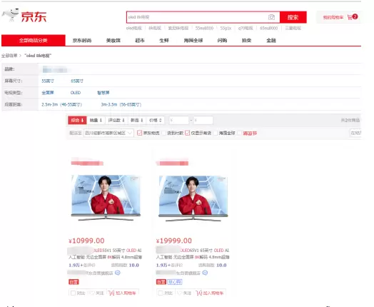 众所周知,OLED在4K时代扮演着高端的角色,无论是索尼、LG还是三星,都有相应的高端代表,但在8K到来前夕,这些采用OLED的高端电视就显得逊色了不少,在京东购物商城搜索关键字电视,并选择分辨率为「8K(7680x4320)」,电视类型选择「OLED」,在弹出的搜索结果中我们发现仅有几款55、65英寸的OLED电视拥有8K分辨率,再搜索70寸以上的OLED 8K电视时,搜索的结果是0,这也代表着目前没有70英寸以上的OLED 8K电视在市场中销售。