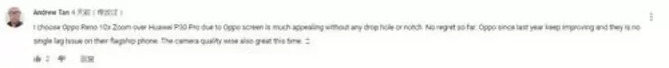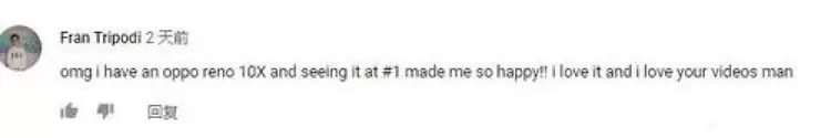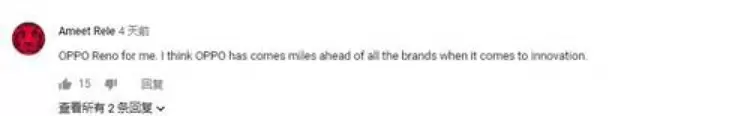 有网友在评论区表示,他认为 OPPO Reno 的创新能力领先于其他所有品牌。也有网友表示称:“相较于华为 P30 Pro,他更喜欢 OPPO Reno 10 倍变焦版,因为 Reno 采用的是真全面屏的设计,它的屏幕没有刘海或缺口,十分美观,而且相机质量也很好。”此外,还有网友在评论区表达了对 Reno 10 倍变焦版的喜爱之情,他热爱 Reno 的机身设计,也热爱 Reno 强悍的摄影能力。