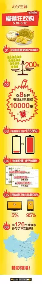 据了解,5月10日的活动开始仅仅8分钟,订单就已经过万。为了确保让吃货们第一时间收获,采摘后的榴莲全程冷链温控被送到苏宁的冷链仓内。消费者上午下单,最快下午就可以在家收到新鲜榴莲。