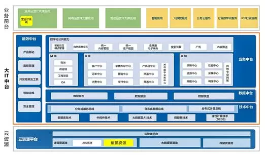 浙江移动的大IT中台产品由能效中台、业务中台、数据中台、技术中台等模块构成,对上为业务前台提供通用业务能力、技术能力、开发运营一体化能力、大数据能力等全方位的IT能力;对下屏蔽各类技术组件、硬件资源的差异,将技术和业务彻底解耦,保障技术组件及硬件资源的更替不影响业务。