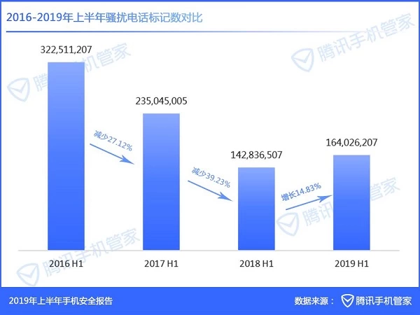 (图:2019年上半年骚扰电话数量较去年同比上涨14.83%)