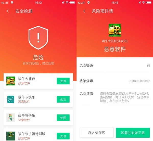 (图:腾讯手机管家查杀“端午节大礼包”病毒软件)