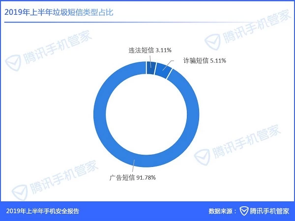 (图:2019年上半年垃圾短信主要为广告短信,占比91.78%)