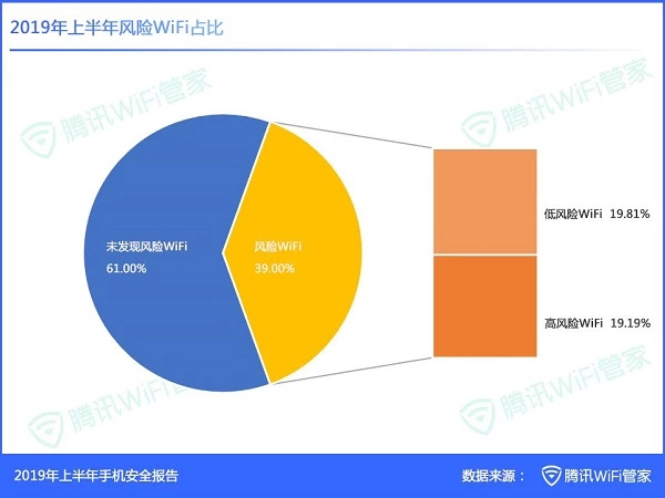 与此同时,风险WiFi也混杂其中,威胁着用户的信息和财产安全。2019年上半年风险WiFi占比39%,其中高风险WiFi占比19.19%,包括ARP攻击、DNS攻击或虚假WiFi行为的WiFi,低风险WiFi则包括未加密、未经认证,存在潜在风险的WiFi。