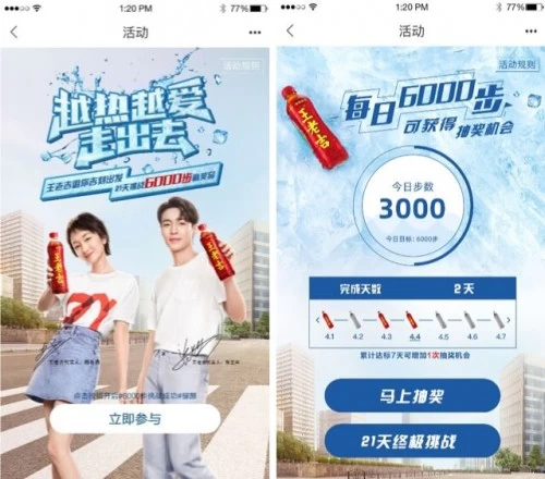 而运动本身与王老吉的传递的健康生活方式,激情的生活态度,不谋而合。王老吉和小米运动以“越热越爱走出去”为主题的打卡6000步运动挑战赛形式的营销。活动期间,通过在小米运动APP引流活动页打卡6000步活动,让用户在在健身同时将年轻化的品牌核心思想灌输给用户。
