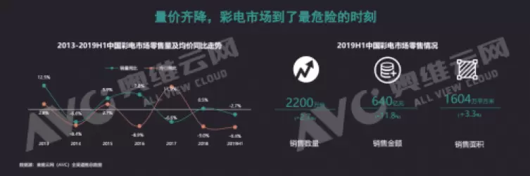日前,奥维云网(AVC)发布数据指出:2019上半年,虽然彩电均价同比下降9.4%,但市场规模并没有实现增长。其中,零售量规模2200万台,同比下降2.7%;零售额规模640亿元,同比下降11.8%。