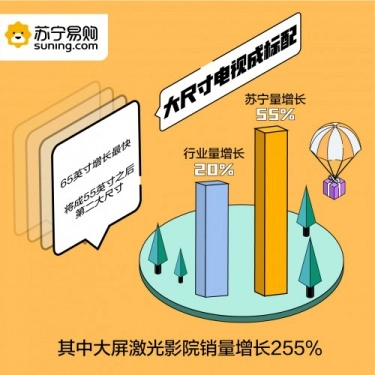 苏宁上半年销售数据显示,65吋产品销量增长达到了55%,以大屏为主要优势的激光电视,也实现了255%的增长。从消费尺寸的关注度可以看到,消费者的选购思路正在朝着更利于改善视觉效果的方向前进,大屏趋势不可逆转。