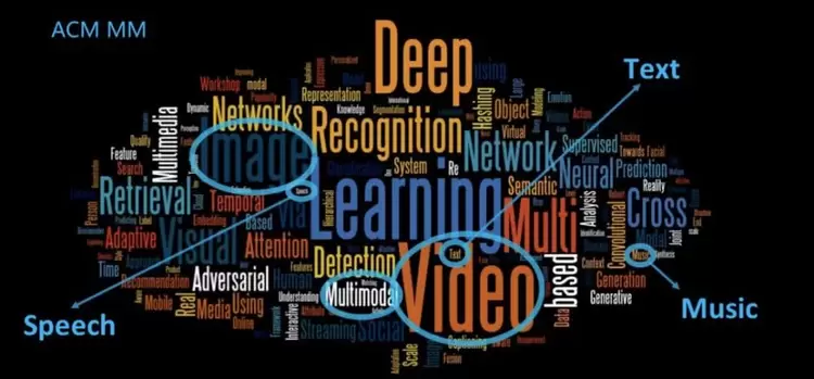 然后我们再看 ACMMM。这是一个交叉学科的会议,领域融合应该做得还不错吧。我们可以看到绝大部分的词是 learning、vedio、image,看起来已经是多媒体的东西,但是你仔细看这里面只有很小一部分是关于音乐 (music)、文字 (text)、声音 (speech)。这说明这里面的发展是不全面的,不是我们想象的那样人工智能蓬勃发展导致整个领域发展是以一个口径或者以一个方向在往前走,其实并没有走到这一步。