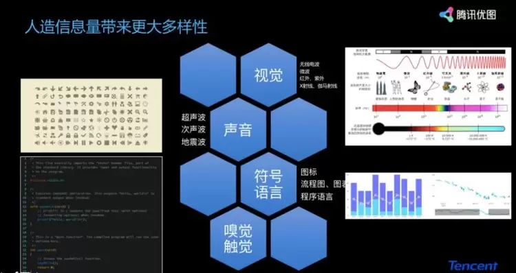 比如说人的眼睛看到可见光,但是在人造的信息里面,可见光是非常小的一部分。在科学探索、实验仪器里面,视觉领域除了可见光,还有微波、红外线、紫外线、X 光等等。在声音里面,除了我们人类听到的声音之外,还有超声波、次声波、地震波等通过现代机器探测设备听到的声音。此外我们还有符号语言,比如图表、编程语言。除此之外还有嗅觉、触觉,这两个领域基本上还没有研究,你不会碰到一个人说我研究嗅觉的,现在大家还见不到这样的专家学者。