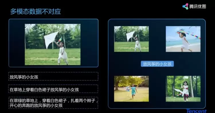 基础难点还包括多种问题,比如多模态数据不对应的问题。我们看到一幅图像后,可以用很多文字形容它:放风筝的小女孩、在草地上穿着白色裙子放风筝的小女孩、在翠绿的草地上,穿着白色裙子,扎着两个辫子,开心的奔跑的放风筝的小女孩。这些都没有错。这很明显是一年级、三年级、五年级小学生写的东西,你能感受到写作层次不一样。