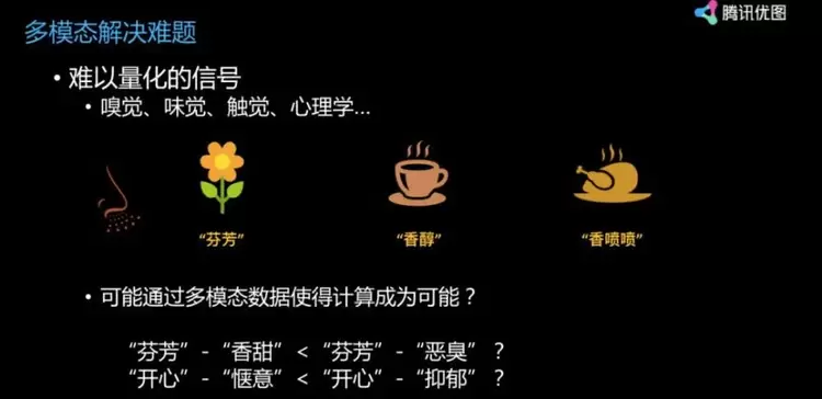 比如你发现原来第一个是「芬芳」,第二个是「香醇」,第三个是「香喷喷」。这些词在你的脑子里立刻被转换成一种感觉。那怎么去表达那种感觉呢?我们是否可以通过多模态计算使得非量化的信号得到计算。比如「芬芳」减去「香甜」小于「芬芳」减去「恶臭」。这个我想大家能够理解。但是要让它在计算机上变成可计算,还需要看看怎么去量化里面那些标准。