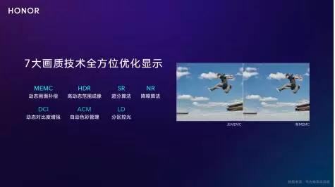 鸿鹄818智慧芯片拥有顶级的画质优化技术,可以为荣耀智慧屏带来极致的画质表现。它搭载魔法画质引擎,通过动态画面补偿(MEMC)、高动态范围成像(HDR)、超分算法(SR)、降噪算法(NR)、动态对比度增强(DCI)、自动色彩管理(ACM)、分区控光(LD)等7大画质技术,全方位提升画面清晰度、对比度,色彩表现等。