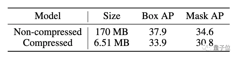 在压缩了25倍的情况下,压缩模型的Box AP和Mask AP都只下降了4左右。