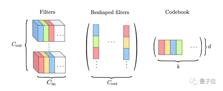 就像这样,在空间上量化卷积滤波器以利用网络中的信息冗余,不同颜色代表拥有不同码字的子向量。