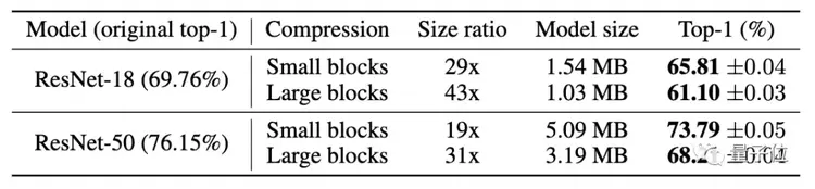 对于ResNet-18,在29倍压缩的情况下,模型大小缩小到了1.54MB,而top-1准确率仅比标准模型降低了不到4%。