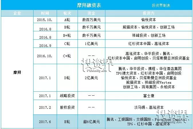 2015年1月成立至今,摩拜单车共完成8轮融资,其中包括股权和战略投资,总金额超10亿美元。腾讯、华平投资、创新工场、高瓴资本、熊猫资本、愉悦资本、红杉资本中国、启明创投、富士康、携程、华住等纷纷入局。
