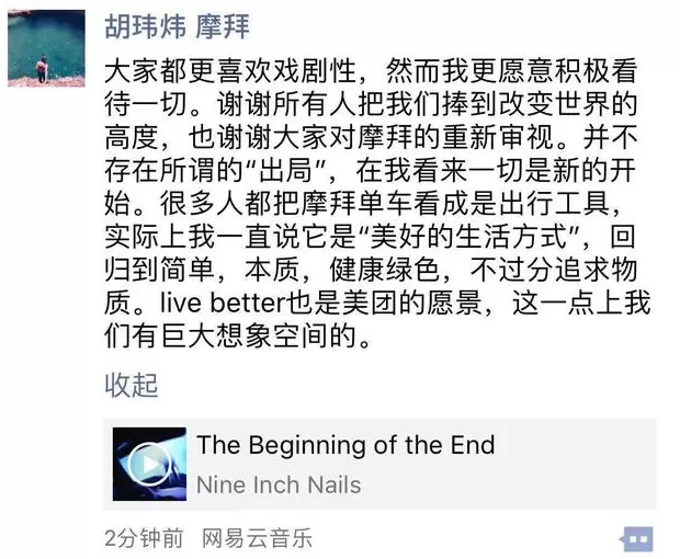 创始人胡玮炜发朋友圈称:“大家都更喜欢戏剧性,然而我更愿意积极看待一切。谢谢所有人把我们捧到改变世界的高度,也谢谢大家对摩拜的重新审视。并不存在所谓的“出局”,在我看来一切是新的开始。很多人都把摩拜单车看成是出行工具,实际上我一直说它是“美好的生活方式”,回归到简单,本质,健康绿色,不过分追求物质。live better也是美团的愿景,这一点上我们有巨大想象空间的。”