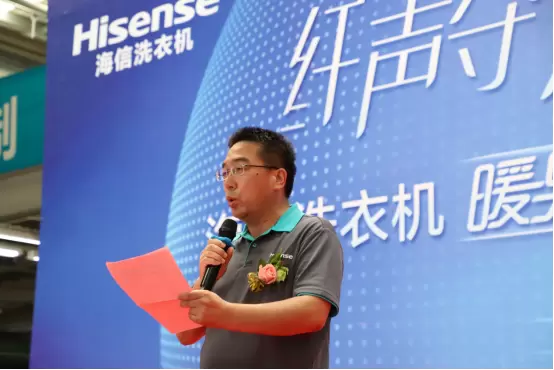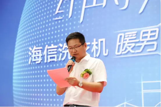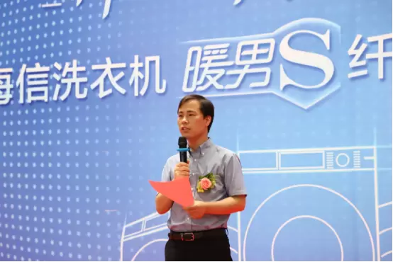 海信家电集团洗衣机事业部营销部总经理杨书华先生发表致辞。他表示,从用户需求和消费痛点出发,以科技和服务,持续打造高质量的好产品,致力于用科技温暖家庭,是海信洗衣机持续强劲发展的源动力。暖男S纤薄系列洗衣机的下线,预示着海信洗衣机产品阵容的进一步升级,必将为海信洗衣机的未来发展注入强大的能量!