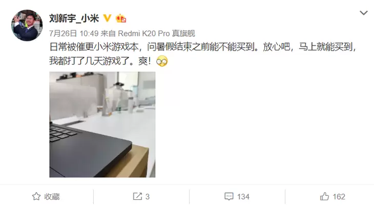 7月29日消息,小米官方宣布将推出全新游戏本,小米集团笔记本电脑部副总经理刘新宇在微博表示“马上就能买到”。