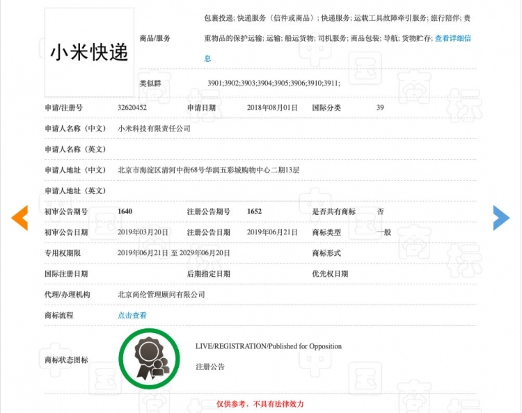 此前,AI财经社从中国商标局公告中了解到,“小米快递”商标已于2019年6月21日通过审核。公告显示,小米公司名下共有6件“小米快递”商标,于2018年8月1日申请注册,注册类别为第39类、第42类、第9类、第38类、第35类。目前,这批商标第38类、第39类已注册成功,1件已初审公告,其余的仍处于“待审”状态。