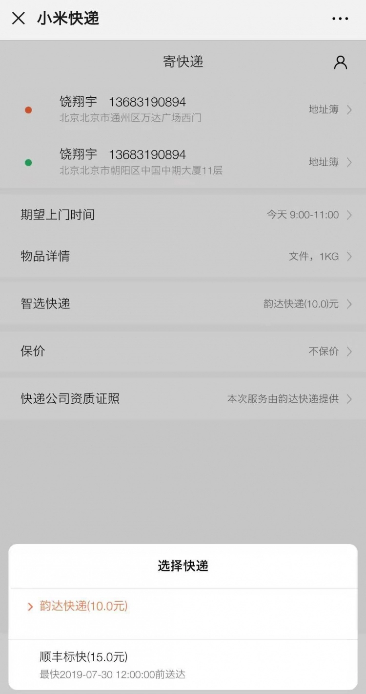 经过测试,AI财经社注意到小米快递的承运公司并非小米公司,而是韵达和顺丰两家快递公司,均可以提供上门取件服务。