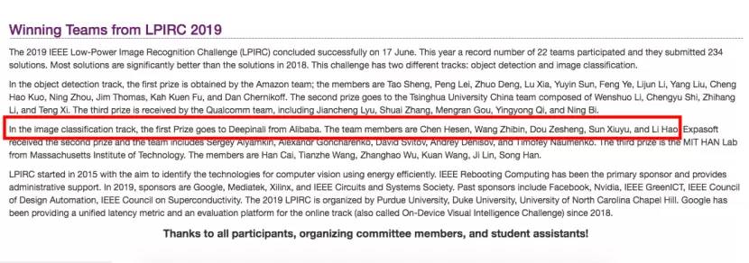 LPIRC2019官网宣布的比赛结果,阿里AI获得在线图像分类任务第一名