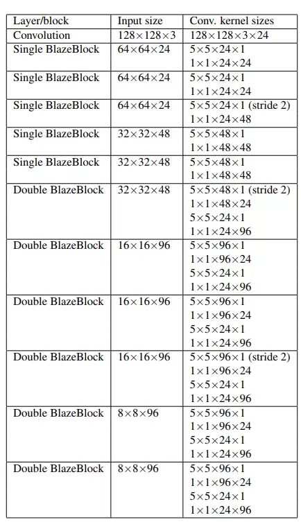 对于具体的例子,我们专注于前置摄像头模型的特征提取器。该特征提取器必须考虑较小范围的目标尺度,因此它具有较低的计算需求。提取器采用 128×128 像素的 RGB 输入,包括一个 2D 卷积和 5 个单 BlazeBlock 和 6 个双 BlazeBlock 组成,完整布局见下表。最大张量深度(通道分辨率)为 96,而最低空间分辨率为 8×8(与 SSD 相比,它将分辨率一直降低到 1×1)。